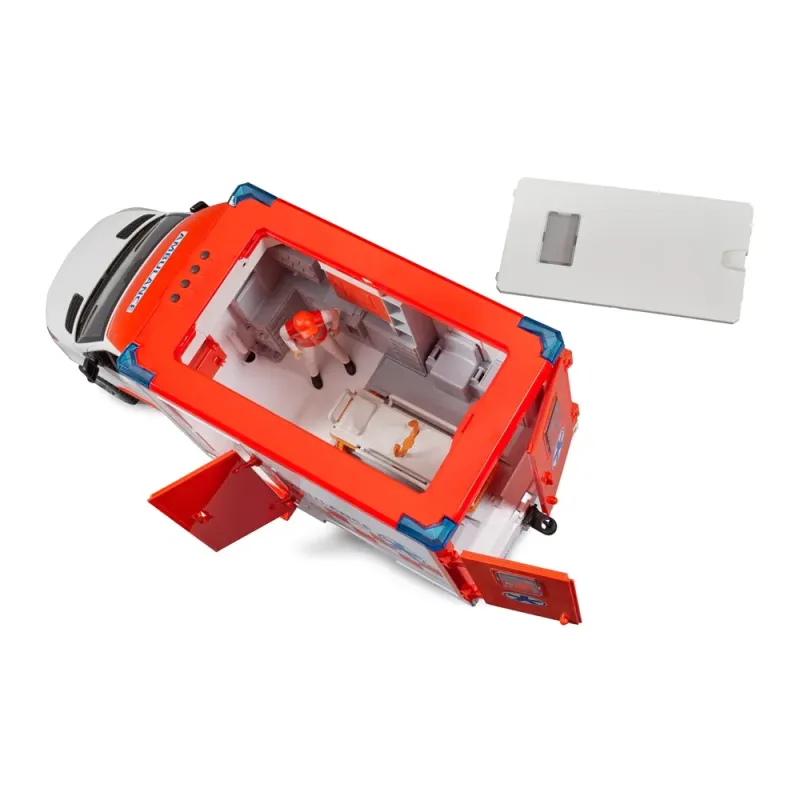 Novatoriškas, efektyvus, patikimas - taip Mercedes Benz apibūdina Sprinter modelio automobilius. Skubios pagalbos tarnybų transporto priemonės yra labai svarbios BRUDER kompanijai. Dabar asortimentą papildė naujasis MB Sprinter greitosios pagalbos automobilis. Atkuriant avarinę situaciją, ši transporto priemonė su daugybe funkcijų yra labai svarbi. Greitosios pagalbos medikas (yra komplektacijoje) gali patekti į kabiną per atidaromomis durimis. Dėl šviesos ir garso modulio su įvairiais sirenų signalais ir apšvietimo funkcijomis, greitosios pagalbos automobilis greitai ir saugiai pasieks bet kokį incidentą. Miniatiūrinis paramedikas gali patekti į moderniausią gydymo zoną per atidaromas galines ir šonines duris bei nuimamą stogo modulį. Bet kokią BWorld figūrėlę galima saugiai gabenti ant reguliuojamo aukščio neštuvų, kurie įvažiuoja ir išvažiuoja iš transporto priemonės.