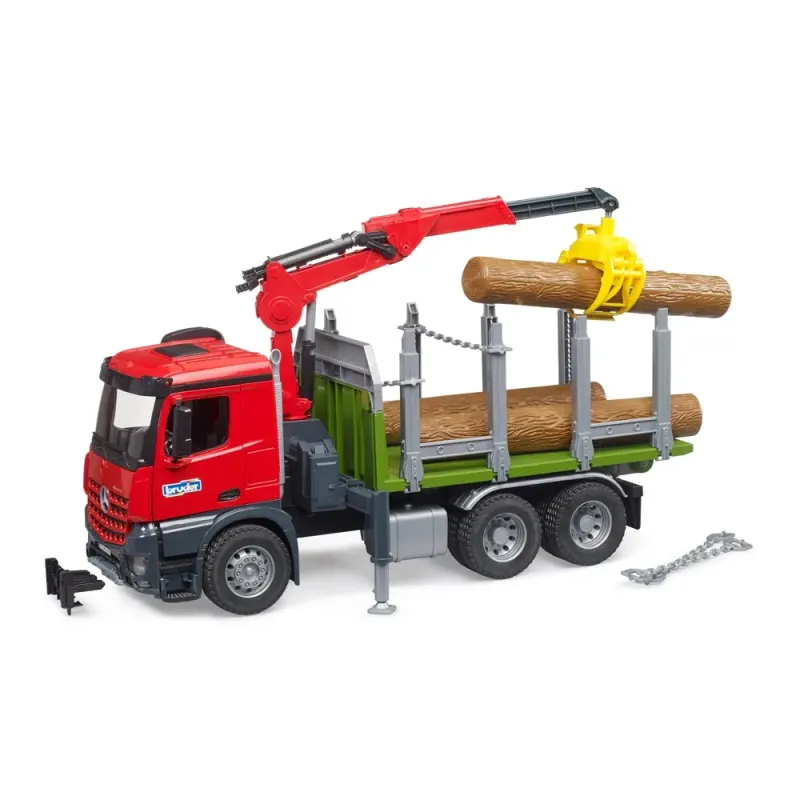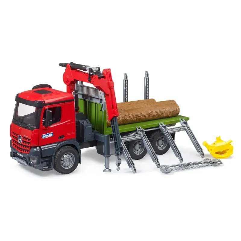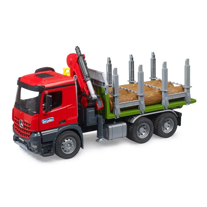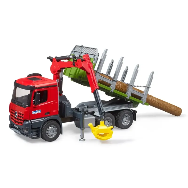 Galia, ilgaamžiškumas ir efektyvumas dažnai yra svarbiausi elementai darbo dieną keliuose ir statybvietėse. Todėl Mercedes-Benz Arocs buvo sukurtas specialiai šiems poreikiams tenkinti. BRUDER kurdamas šį modelį daug dėmesio skyrė gaminiams būdingam patvarumui, o kabinoje įrengė atidaromas duris, kad BRUDER žaislinės figūrėlės galėtų patekti į transporto priemonę. Pakrovimo kranas turi medienos griebtuvą rąstams perkelti. Medienos griebtuvą galima užfiksuoti atidarytoje padėtyje. Kai reikia patraukti rąstą, medienos griebtuvas nuleidžiamas ant jo ir, kai rąstai liečiasi viduryje, griebtuvas automatiškai užsidaro. Tai tik vienas šio sunkvežimio funkcionalumo pavyzdys. Kiti svarbiausi akcentai - ištraukiamos ir nuleidžiamos krano atramos, taip pat grandinės ant krovimo platformos stovų kroviniams tvirtinti. Atramas taip pat galima nulenkti žemyn, kad medieną būtų galima krauti šonu. Sunkvežimį galima iškrauti pakreipus krovimo platformą.