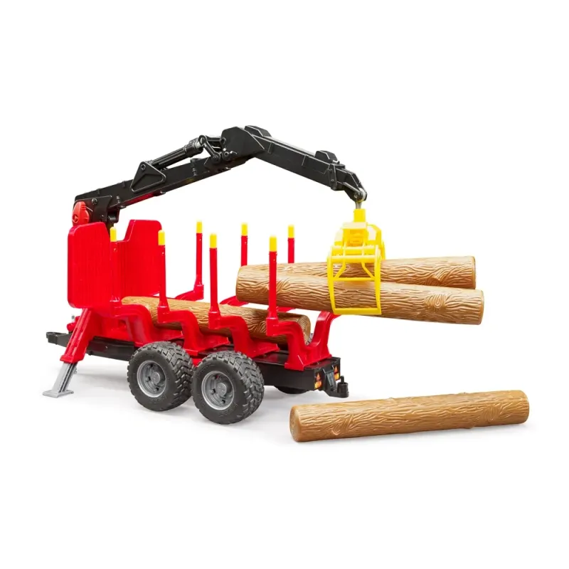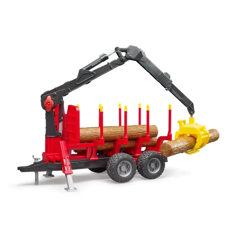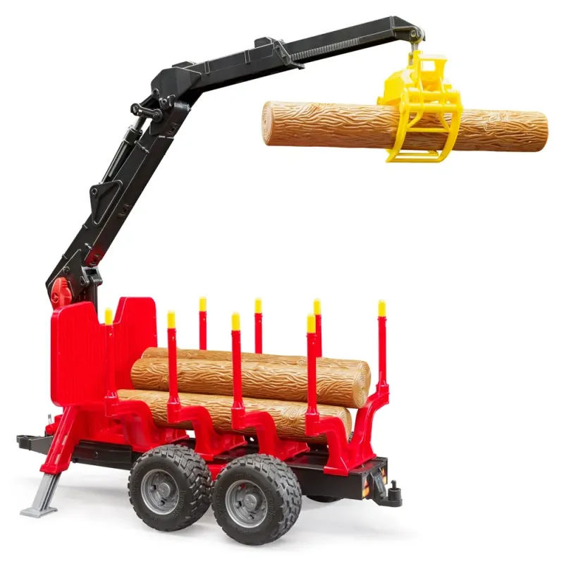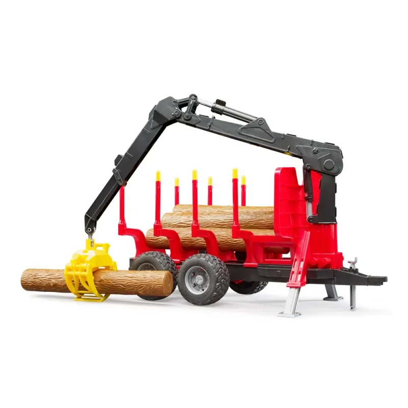 BRUDER miškininkystės asortimentas išsiplėtė. Ši funkcionali priekaba su griebtuvu, keturiais reguliuojamais statramsčiais ir keturiais rąsteliais yra paruošta žaisti. Ji labai funkcionali, o detalės labai tikroviškos. Dėl priekabos svyruojančių ašių ji lengvai įveikia sudėtingą reljefą. Modelis turi besisukantį ir pasukamą kraną, todėl rąstai ne tik vežami, bet ir pakraunami bei iškraunami. Dėl standartinio galinio sukabinimo įtaiso galima pritvirtinti papildomus agregatus.