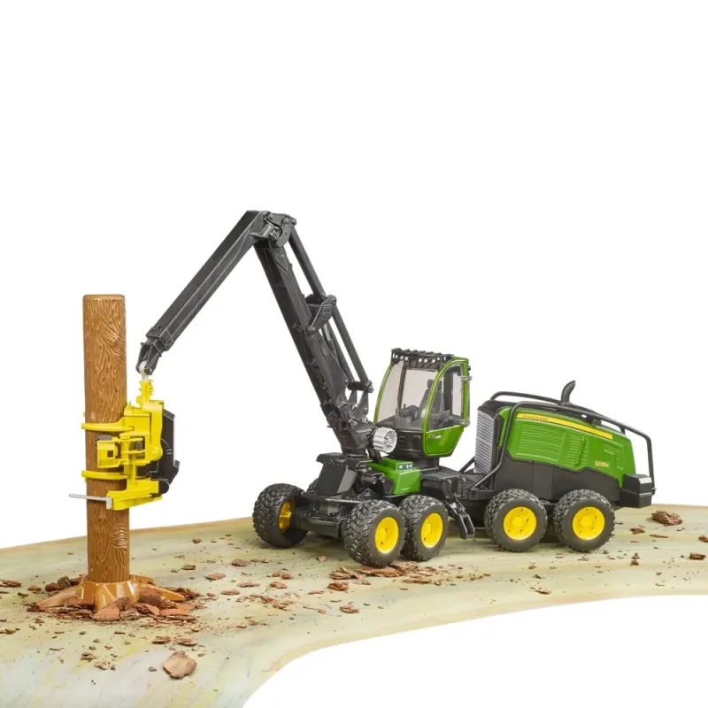 John Deere gali pasigirti ilgomis miškininkystės tradicijomis. Šis įspūdingas ir labai detalus miško traktorius dabar įtrauktas į BRUDER miškininkystės teminį pasaulį. Papildomai įsigyjama BWorld figūrėlė per atidaromas duris patenka į modernią besisukančią kabiną. Važiuoklė su svyruojančiomis ašimis ir padangomis su protektoriumi labai tinka sudėtingoms bekelėms. Pilnai valdomoje krano strėlėje yra judantys griebtuvai, transportavimo volai ir pjovimo įrenginys. Dabar vaikai gali iš karto pradėti realiai kirsti medieną, nes į kompletaciją įeina medžio kamienas su nuimamomis šaknimis.