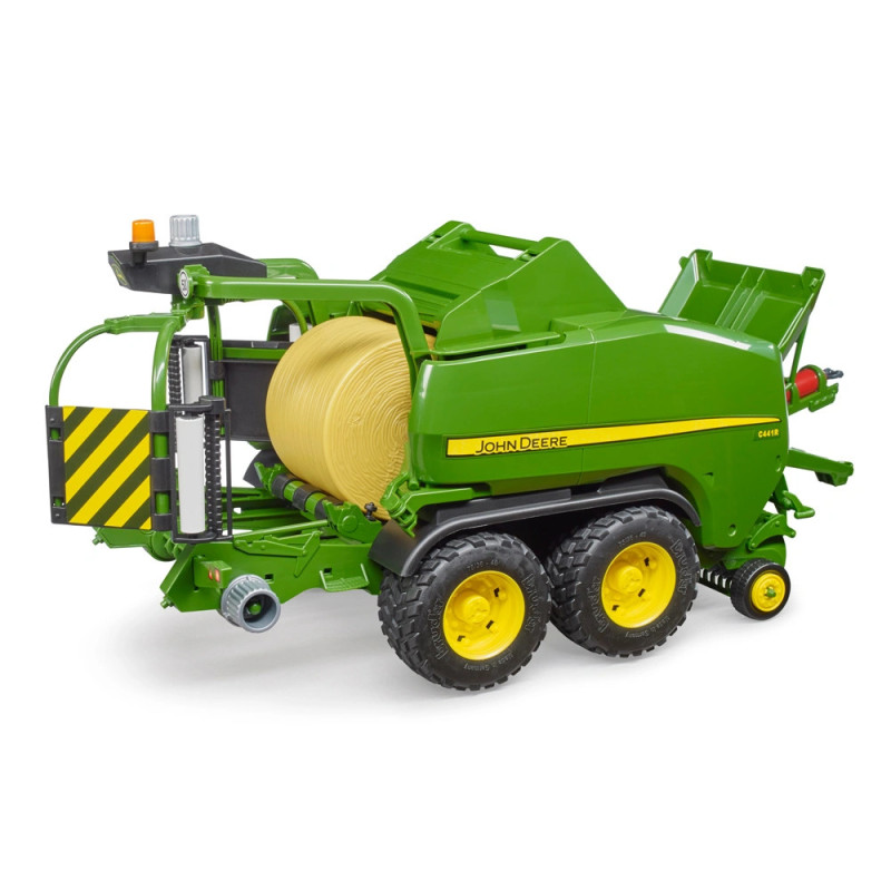 John Deere gerai žinoma ne tik dėl savo traktorių, bet ir dėl naujoviškų derliaus nuėmimo mašinų. Kombinuotas presas C441R yra idealus įrankis šiaudams ir šienui nuimti. Dėl pažangiausios presavimo ir transporterio technologijos, šis presavimo ir vyniojimo įrenginys per valandą pagamina iki 60 rulonų. Ši derliaus nuėmimo mašina - tai naujas BRUDER žemės ūkio tematikos pasaulio papildymas. Viršuje esančio atvartėlio dėka jaunieji ūkininkai gali įdėti šiaudų ryšulius. Naudojant naują konvejerio sistemos mechanizmą šiaudų ryšulius galima perkelti iš presavimo kameros į vyniojimo įrenginį, o besisukantis plėvelės vyniotuvas užbaigia rulono sukimo procesą. Siekiant dar didesnio panašumo į originalą, į komplektą taip pat įeina apvyniotas šieno rulonas.