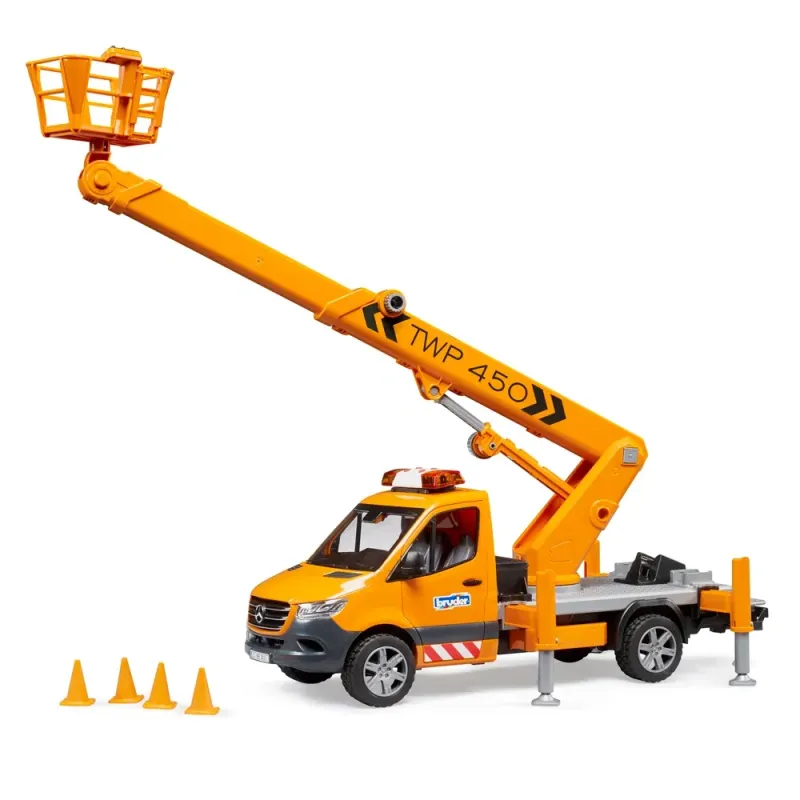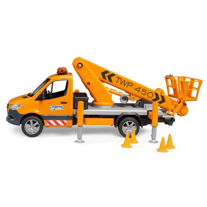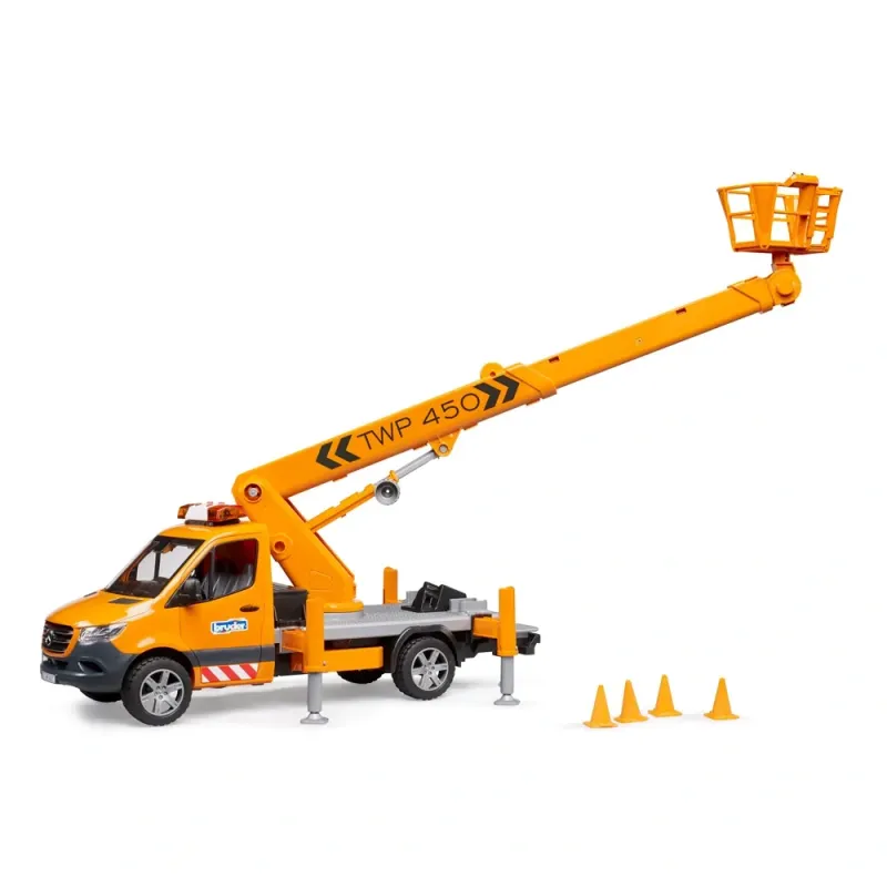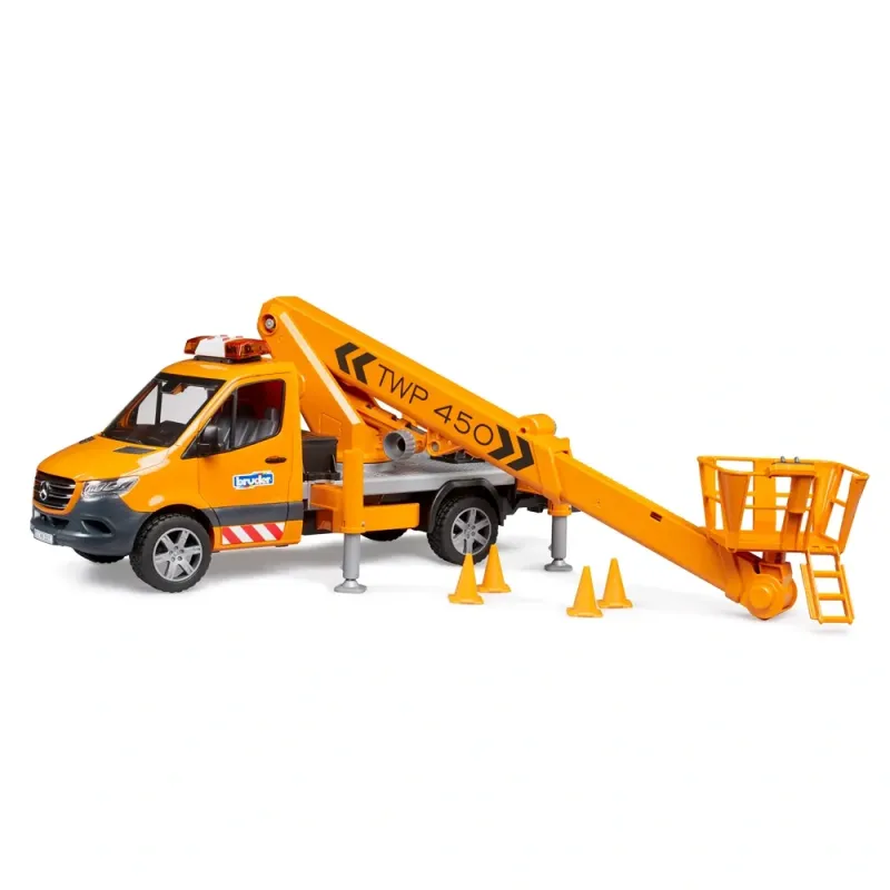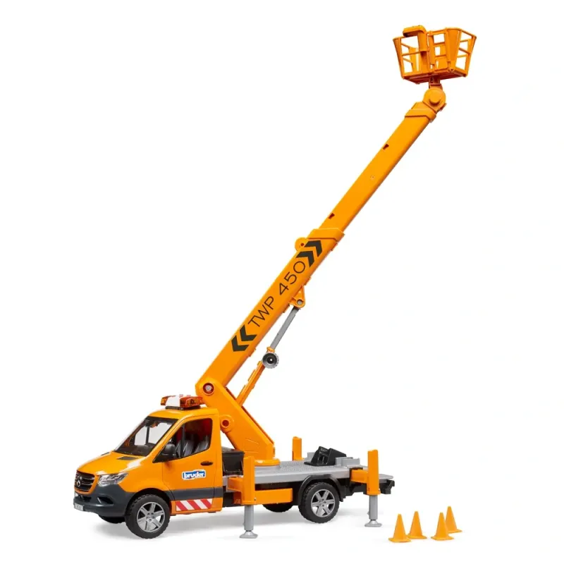 Mobilios darbinės platformos reikalingos darbams aukštyje, pavyzdžiui, prie medžių, gatvių apšvietimo ar kelio ženklų. BRUDER darbo platforma kiekvieną BWorld figūrą saugiai iškelia į 70 cm aukštį! Dėl specialios technologijos darbininkų bokštelis visada išlieka horizontalioje padėtyje, kai krano strėlė iškelta. Transporto priemonė sutvirtinama 4 ištraukiamais stabilizatoriais, taip pat pridedami 4 stulpeliai, skirti darbo zonai aptverti. Žinoma, sprinterio kabinos duris galima atidaryti, o saugumui ir geram transporto priemonės atpažinimui užtikrinti sumontuotas šviesos ir garso modulis.