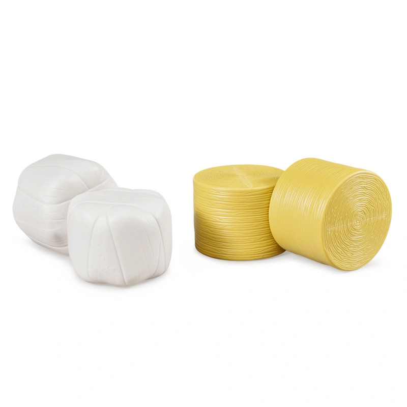 Keturi apvalūs šieno rulonai, po 2 vnt.: suvynioti (balti) ir nesuvynioti (gelsvos spalvos), idealiai tinka prie šieno rulonų vyniotuvo.